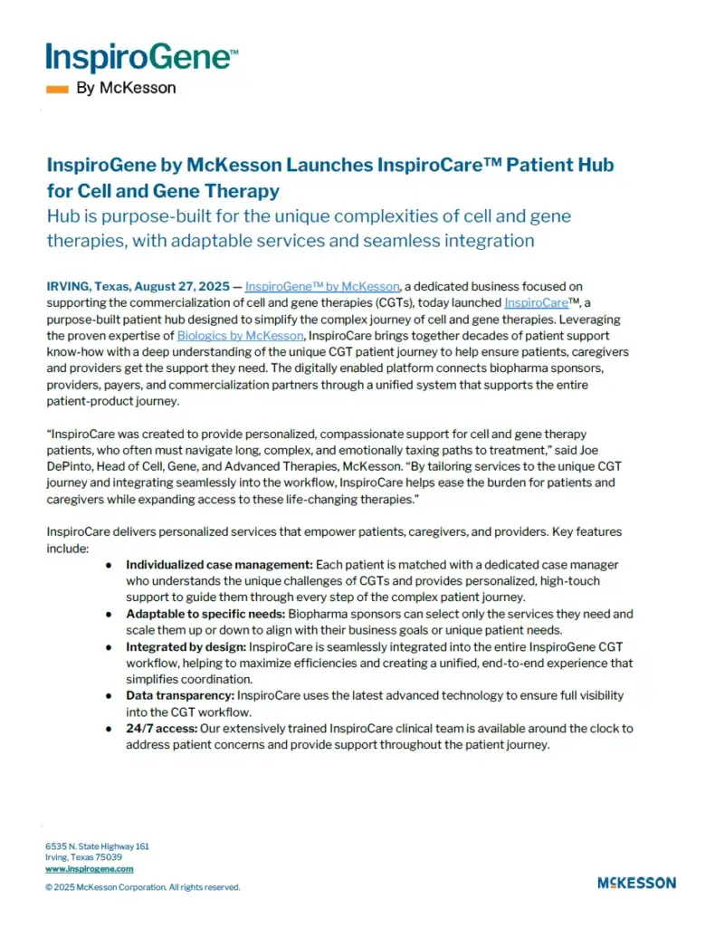 InspiroGene by McKesson Launches InspiroCare™ Patient Hub for Cell and Gene Therapy Download PDF InspiroGene by McKesson Launches InspiroCare™ Patient Hub for Cell and Gene Therapy Download PDF