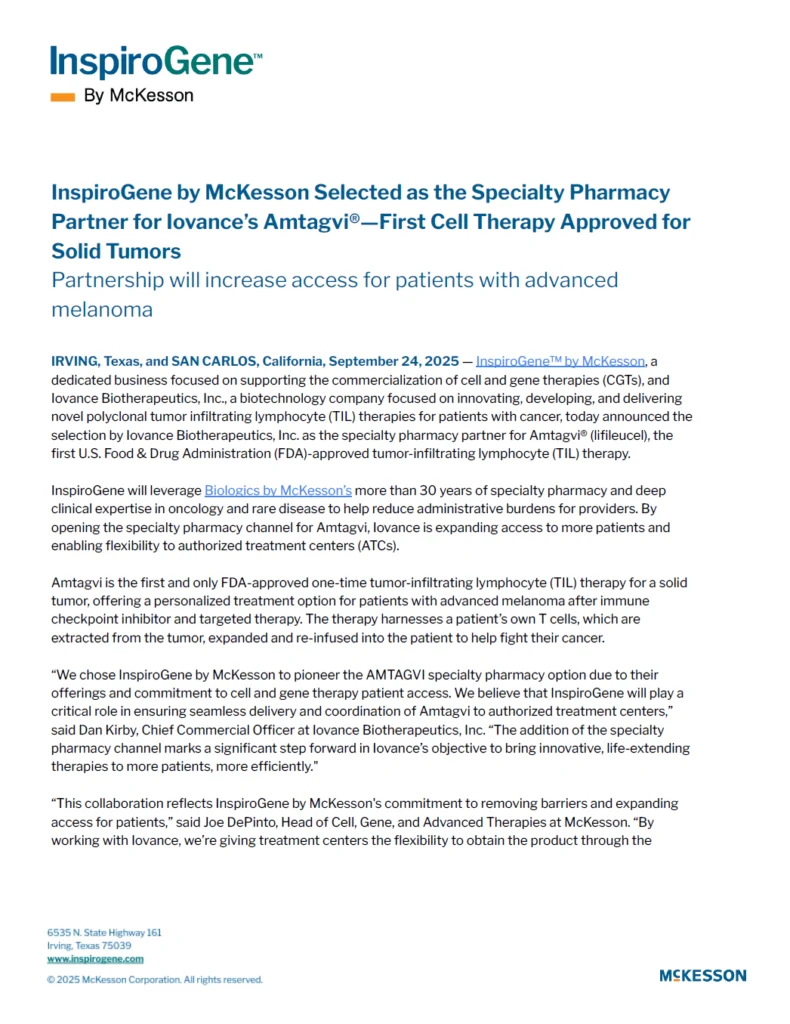 InspiroGene by McKesson Selected as the Specialty Pharmacy Partner for Iovance’s Amtagvi®—First Cell Therapy Approved for Solid Tumors Download PDF InspiroGene by McKesson Selected as the Specialty Pharmacy Partner for Iovance’s Amtagvi®—First Cell Therapy Approved for Solid Tumors Download PDF