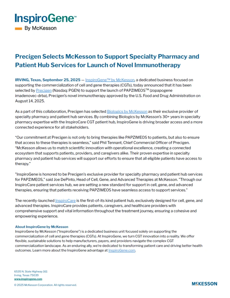 Press Releases Precigen Selects McKesson to Support Specialty Pharmacy and Patient Hub Services for Launch of Novel Immunotherapy Download PDF Precigen Selects McKesson to Support Specialty Pharmacy and Patient Hub Services for Launch of Novel Immunotherapy Download PDF InspiroGene by McKesson Selected as the Specialty Pharmacy Partner for Iovance’s Amtagvi®—First Cell Therapy Approved for Solid Tumors Download PDF InspiroGene by McKesson Selected as the Specialty Pharmacy Partner for Iovance’s Amtagvi®—First Cell Therapy Approved for Solid Tumors Download PDF InspiroGene by McKesson Launches InspiroCare™ Patient Hub for Cell and Gene Therapy Download PDF InspiroGene by McKesson Launches InspiroCare™ Patient Hub for Cell and Gene Therapy Download PDF InspiroGene by McKesson Partners with Vertex to Expand Distribution Options for CASGEVY® (exagamglogene autotemcel) Download PDF InspiroGene by McKesson Partners with Vertex to Expand Distribution Options for CASGEVY® (exagamglogene autotemcel) Download PDF Treatment Centers Map View our interactive tool to see where CGT care is available EXPLORE MAP See what we can do for you GET IN TOUCH
